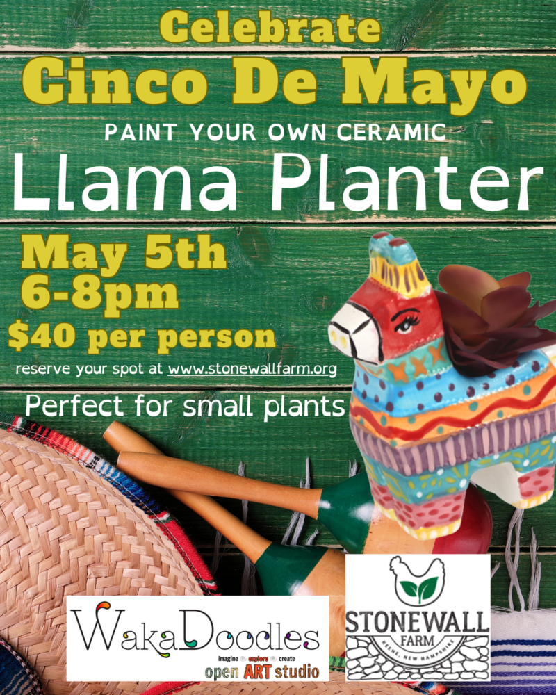 Everyone will create a fully painted llama planter; the instructor will kiln-fire pieces after the class, and they’ll be available for pickup at Brewbakers in Keene.
