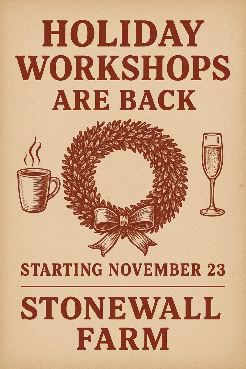 Starting November 23rd, Stonewall Farm is bringing back our beloved series of holiday workshops! Gather your friends, sip hot cocoa or even a glass of champagne, and get ready for fun and festive nights out.